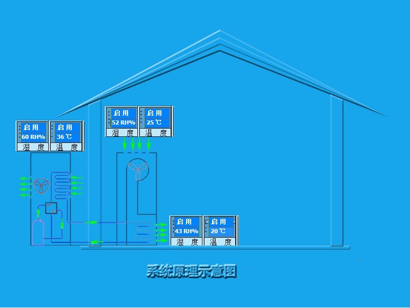 當(dāng)室內(nèi)溫濕度與要求值差距較大且通過新風(fēng)系統(tǒng)不能滿足要求時,系統(tǒng)開啟制冷、制熱功能,同時系統(tǒng)關(guān)閉進(jìn)出風(fēng)口風(fēng)閥起保溫功能。
